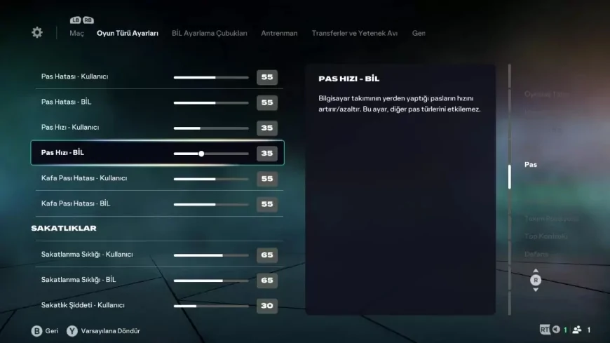 Bazı varsayılan dengelerde AI şutları kullanıcıya göre daha sert ayarlı olabiliyor. Sizde “kaleye füze geliyor” hissi oluşursa AI şut hızını 72’den aşağı çekmekte sakınca yok.